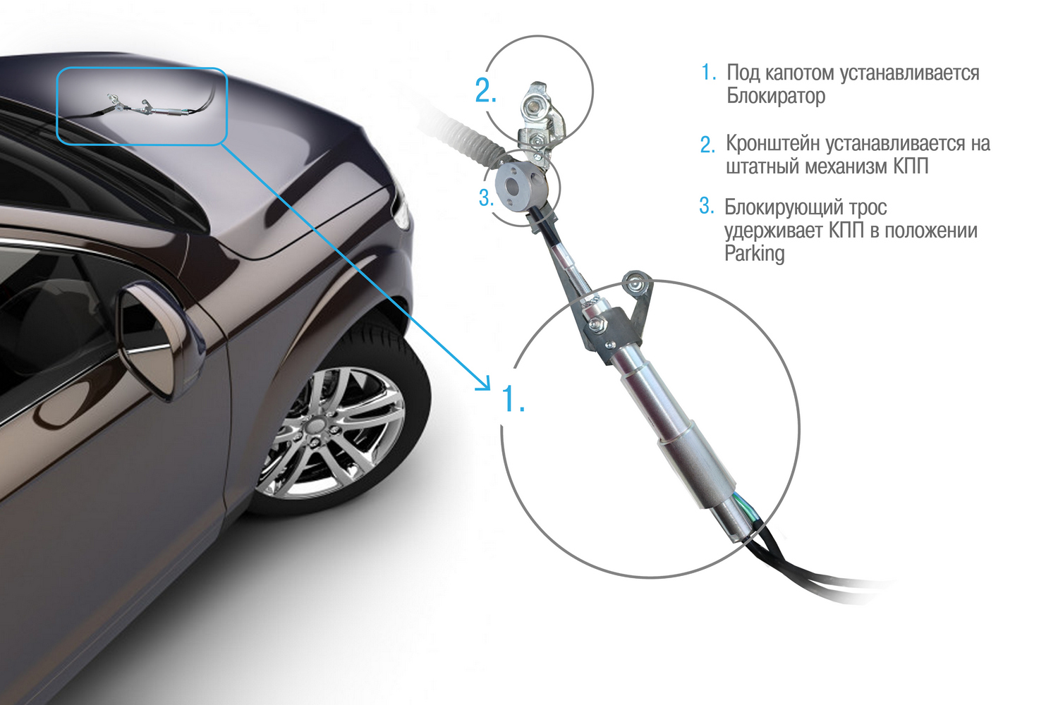 Блокировка не рычага переключения КПП в салоне, а кулисы КПП под капотом - более надёжная система блокировки. В сочетании с замком капота, эта система защиты может являться полноценным противоугонным комплексом, который поставит в тупик любого угонщика.