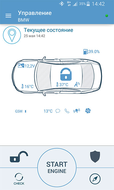 – Контроль текущего состояния ваших автомобилей: состояние всех охраняемых зон и датчиков, текущий остаток топлива в баке (зависит от подключения), температуры двигателя, температуры в салоне автомобиля, температуры за бортом (требуется подключение датчика), текущее местоположение автомобиля.