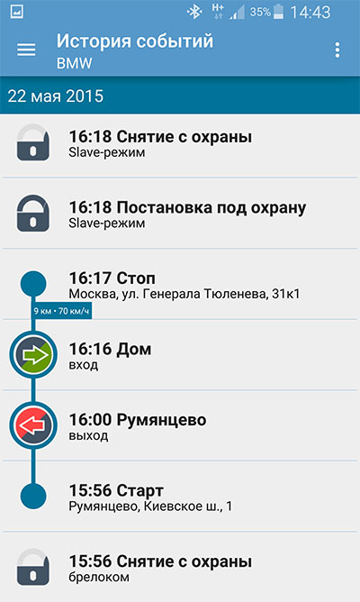 – История событий с координатами, точным временем и состоянием всех охранных зон, датчиков и другой служебной информацией.