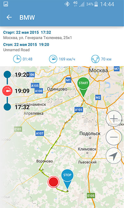 – История перемещения автомобиля с направлением движения, с указанием скоростного режима, информацией о каждой поездке.